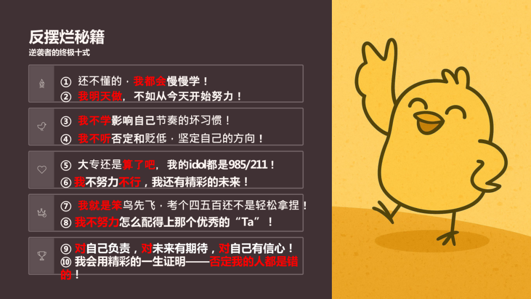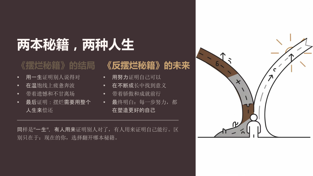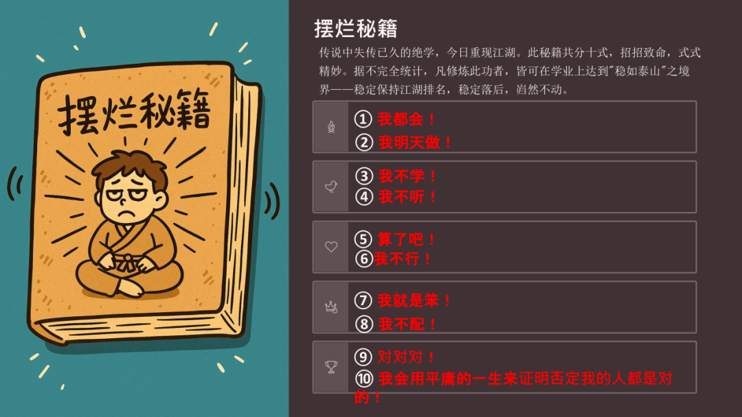 当《摆烂秘籍·十式》一出现,教室先是笑声不断:“这不就是我吗!”但随着老师逐条讲解,笑声逐渐消失,孩子们的表情从轻松变得沉默。当老师读到最后一句——“我会用最平庸的一生证明否定我的人都是对的”,刚刚还在大笑的孩子们,此刻神情收敛、严肃而专注,他们逐渐意识到:摆烂,是要以未来为代价的。